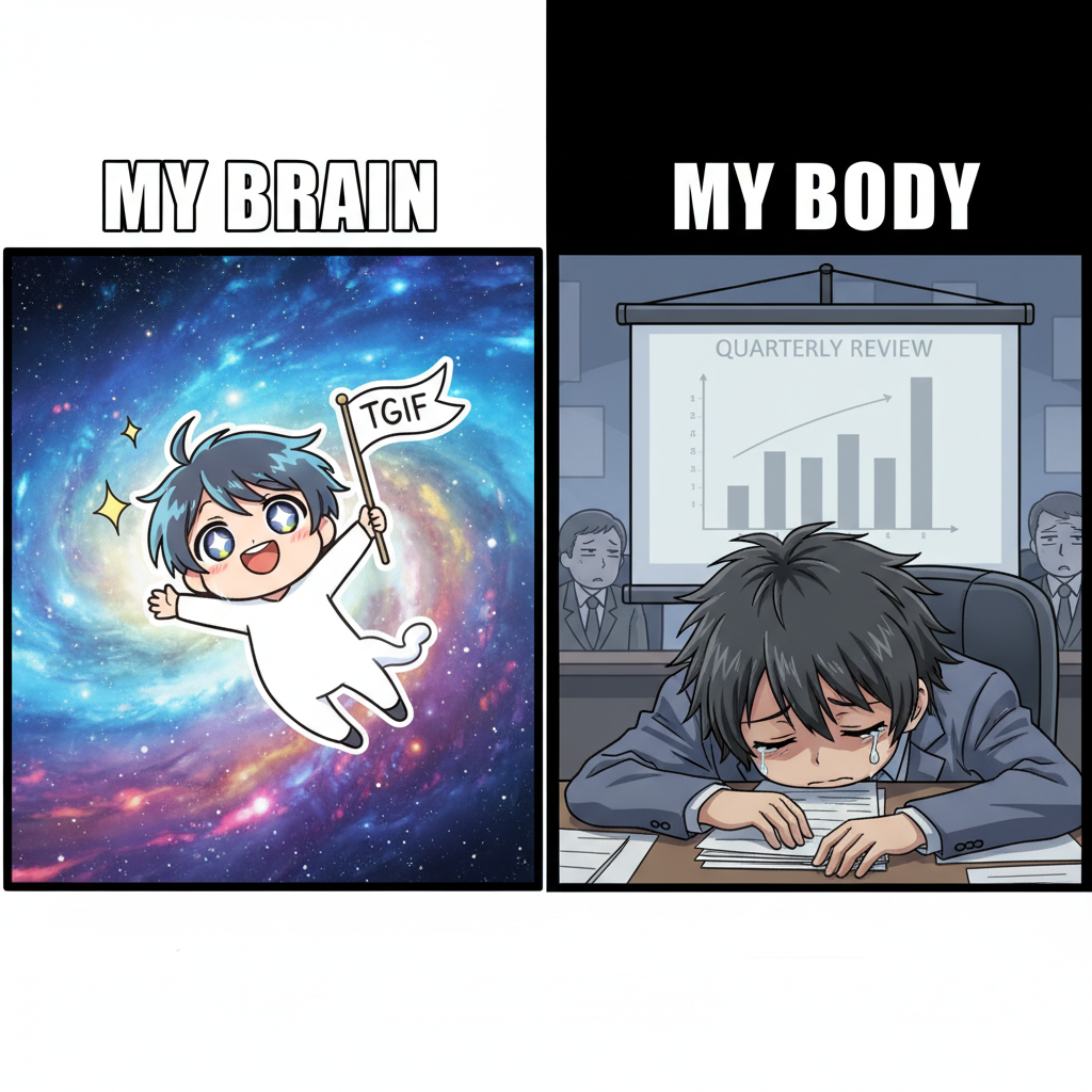 My brain clocking out at 4:59 PM vs. my body still stuck in a meeting