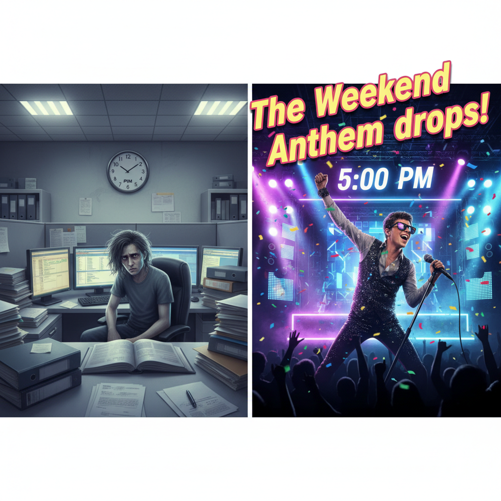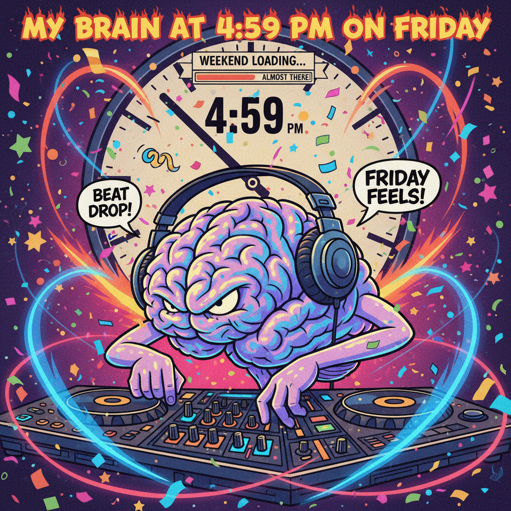 My brain on Friday at 4:59 PM vs. 5:00 PM: The Weekend Anthem drops!